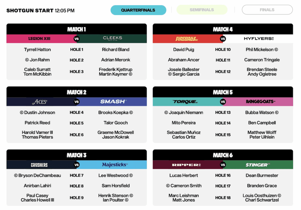Johnson tuvo la oportunidad de elegir entre Ripper GC, Stinger GC o Smash GC, y se inclinó por el octavo sembrado, Smash. Luego pudo haber optado por enfrentarse a su excompañero en 4Aces, Talor Gooch, pero en su lugar eligió a Koepka, quien tiene cinco victorias en LIV Golf, la segunda mayor cantidad después de las siete de Niemann.