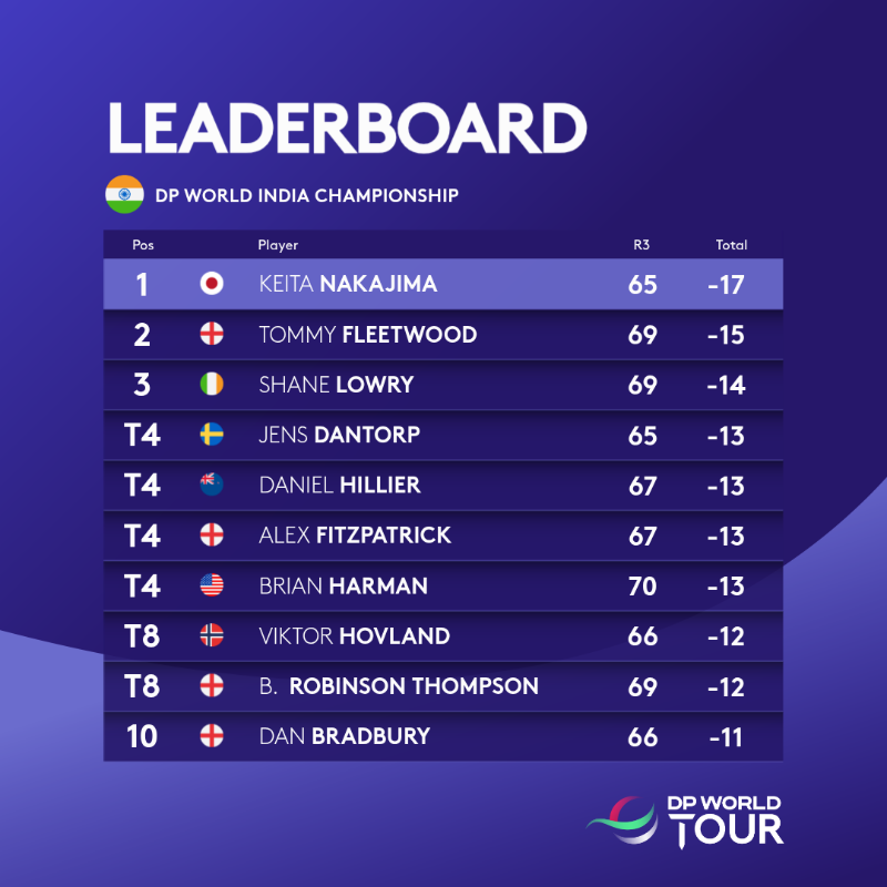 El golfista japonés Keita Nakajima firmó una ronda sin bogeys de 7-bajo par (65) para tomar una ventaja de dos golpes en el DP World India Championship tras la tercera jornada del sábado, quedando a las puertas de su segundo título en el DP World Tour.